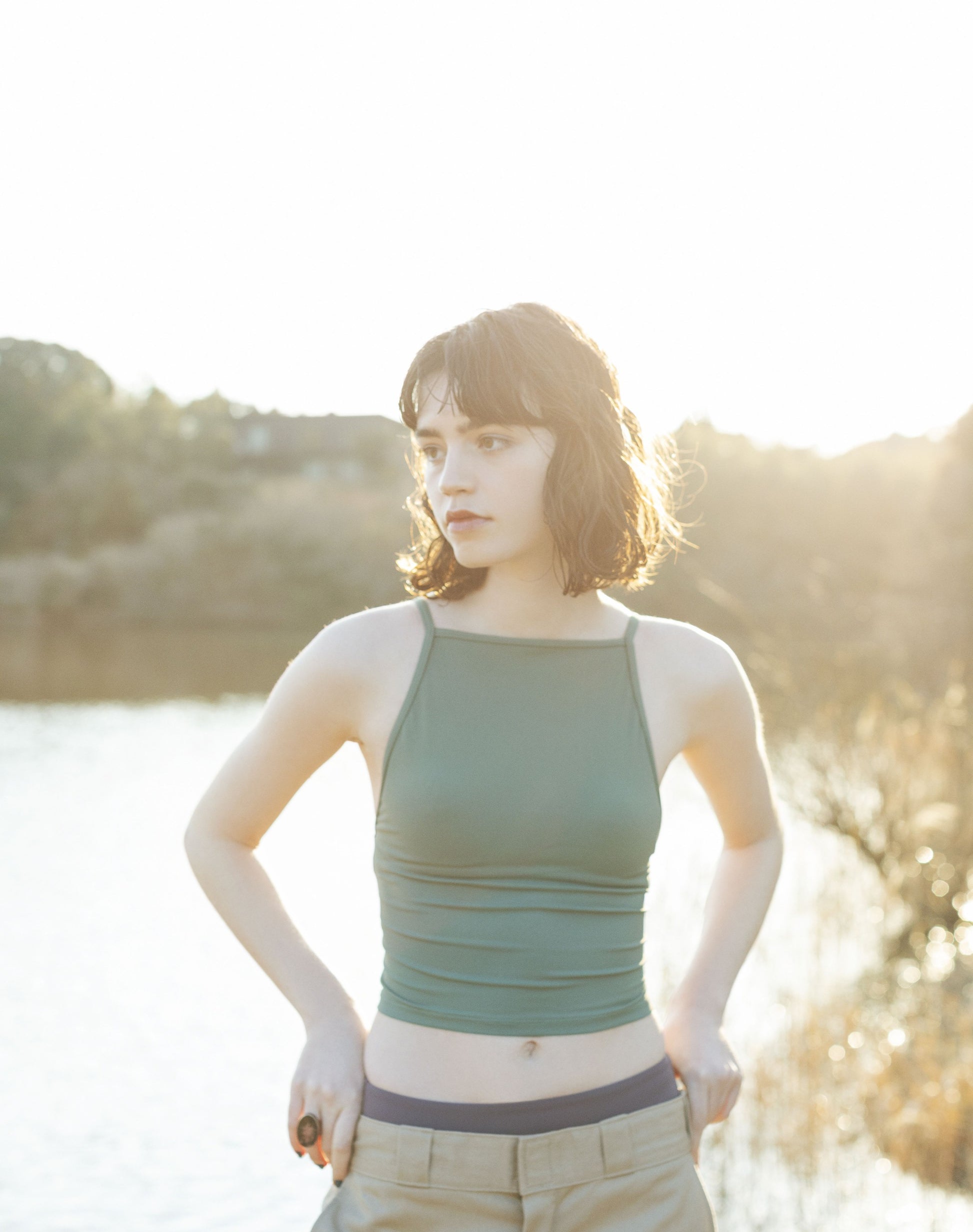 バックが開いたハイネックのスイムタンク。肩幅のある方でも美しく見える、計算されたシルエットです。