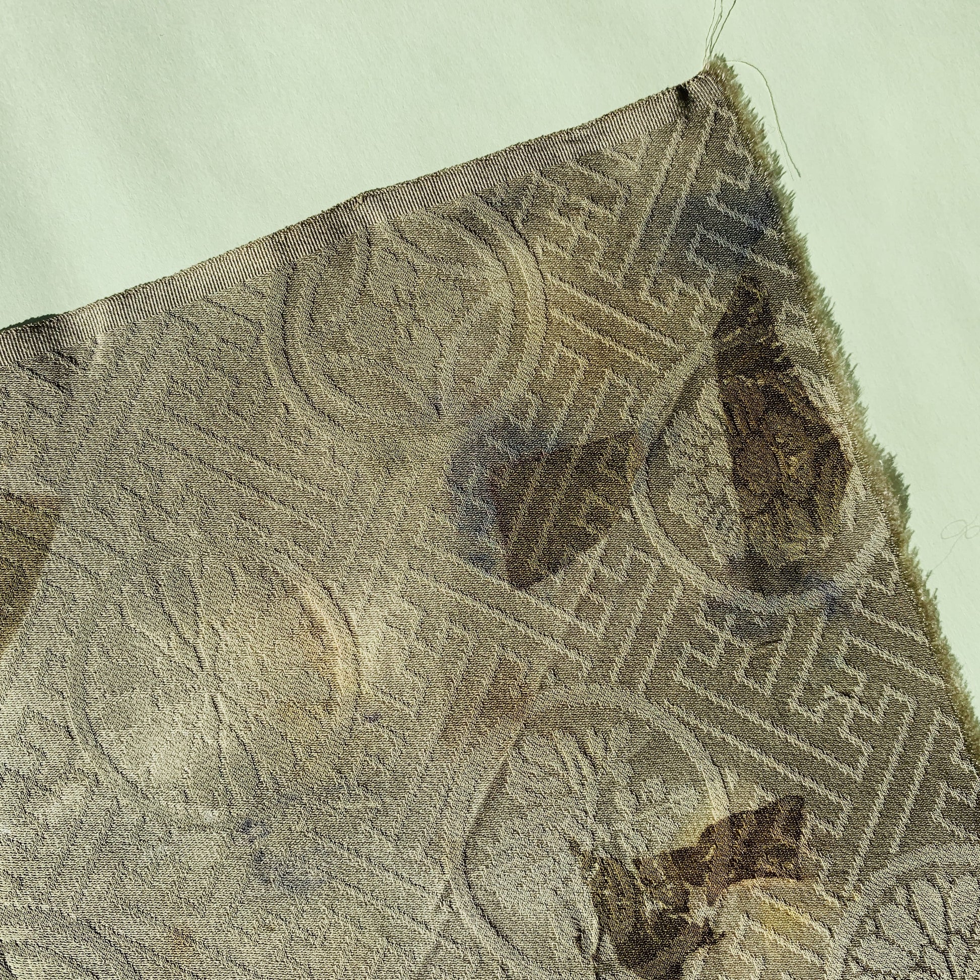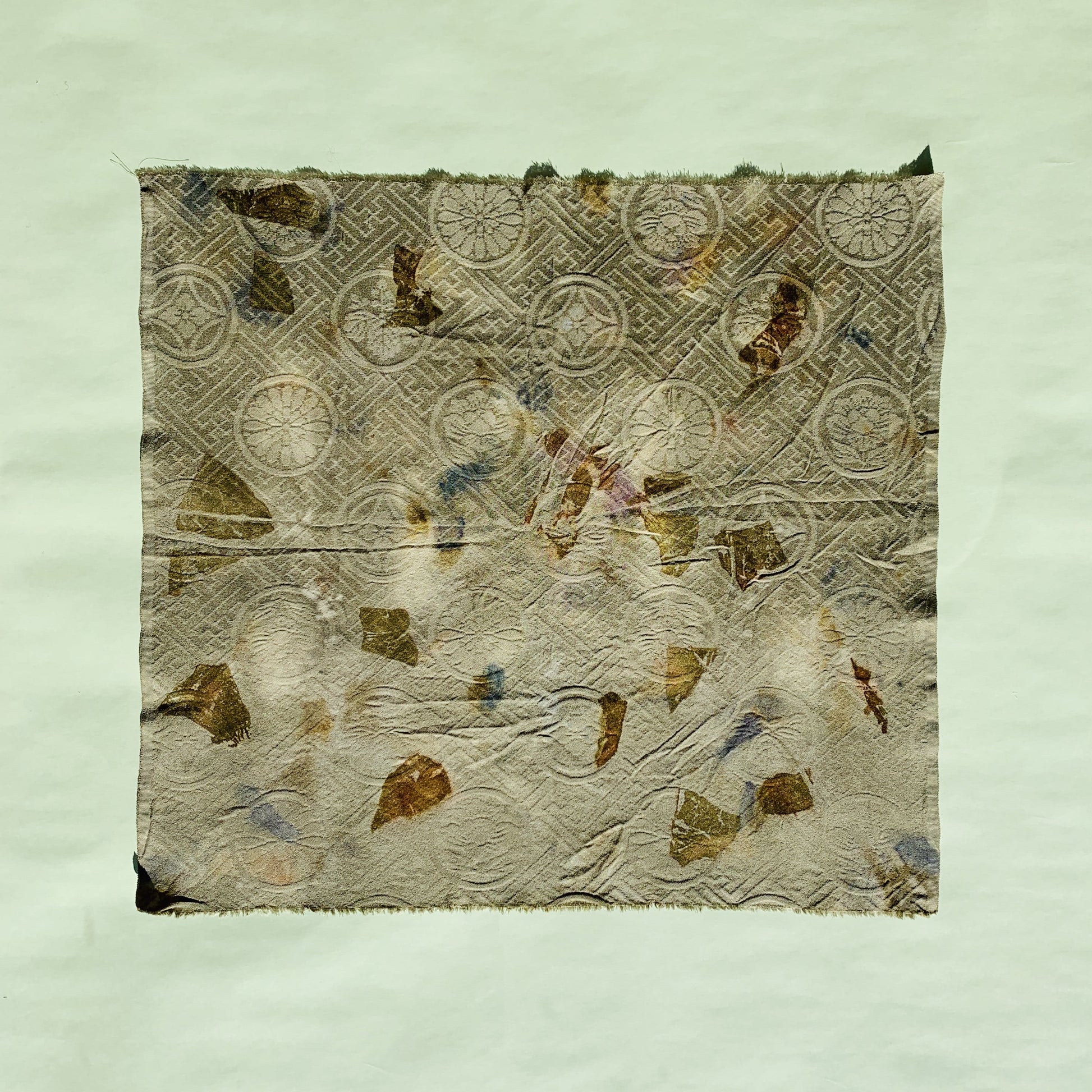 This piece, “Ajisai”, uses Hydrangea leaves as the basal dye bath, layered by subsequent imprints of wildflowers, onion and pumpkin skins.