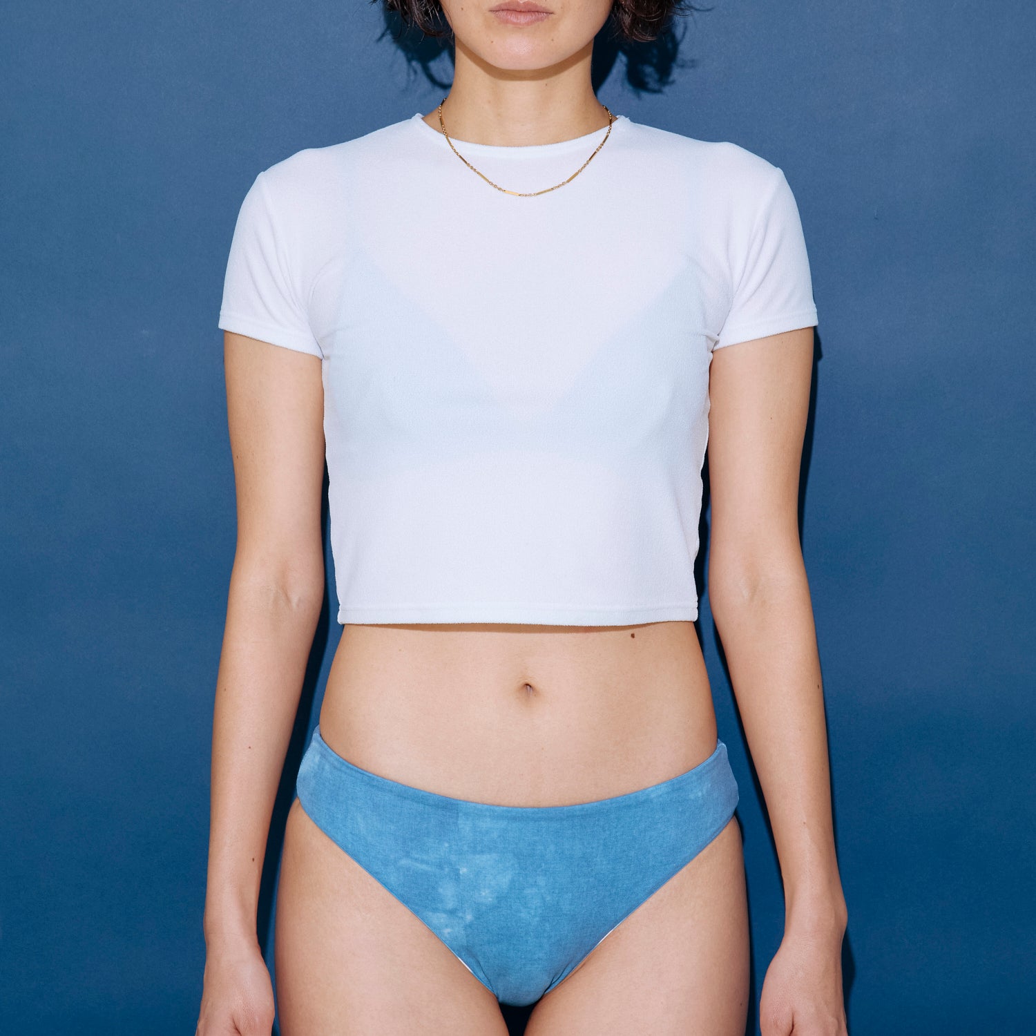 スイム素材のTシャツ。重ね着を楽しんでもらいたいため、あえてパット袋なしに仕上げています。ビキニトップやブラを下に着用するのがおすすめですが、上にタンクトップを合わせるレイヤードスタイルもOK。