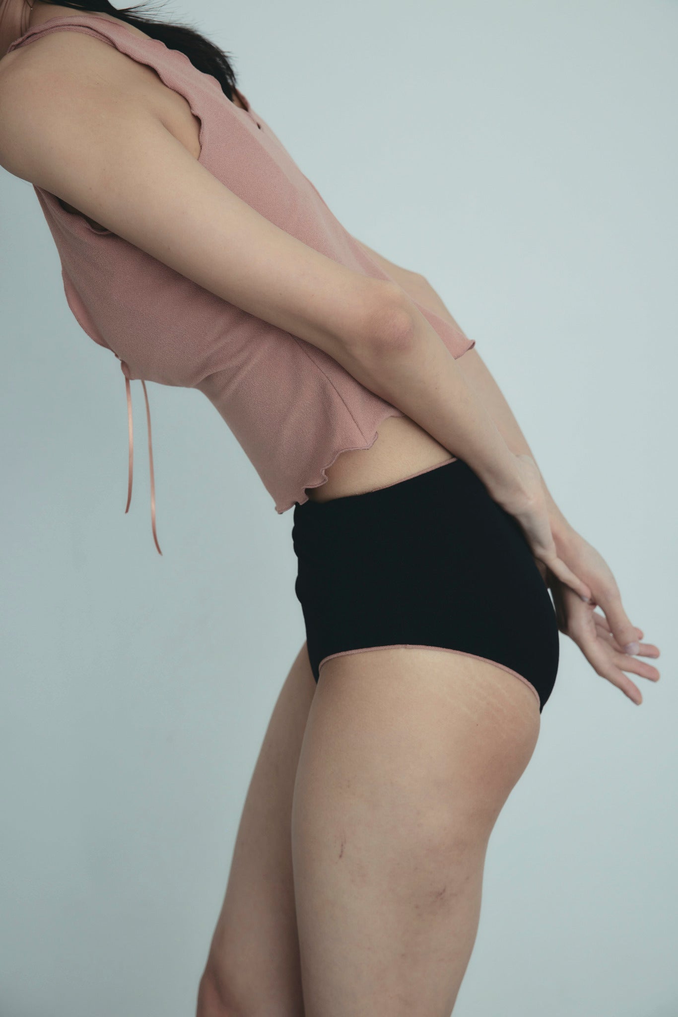 リバーシブルで使えるミドルウエストのビキニボトム。