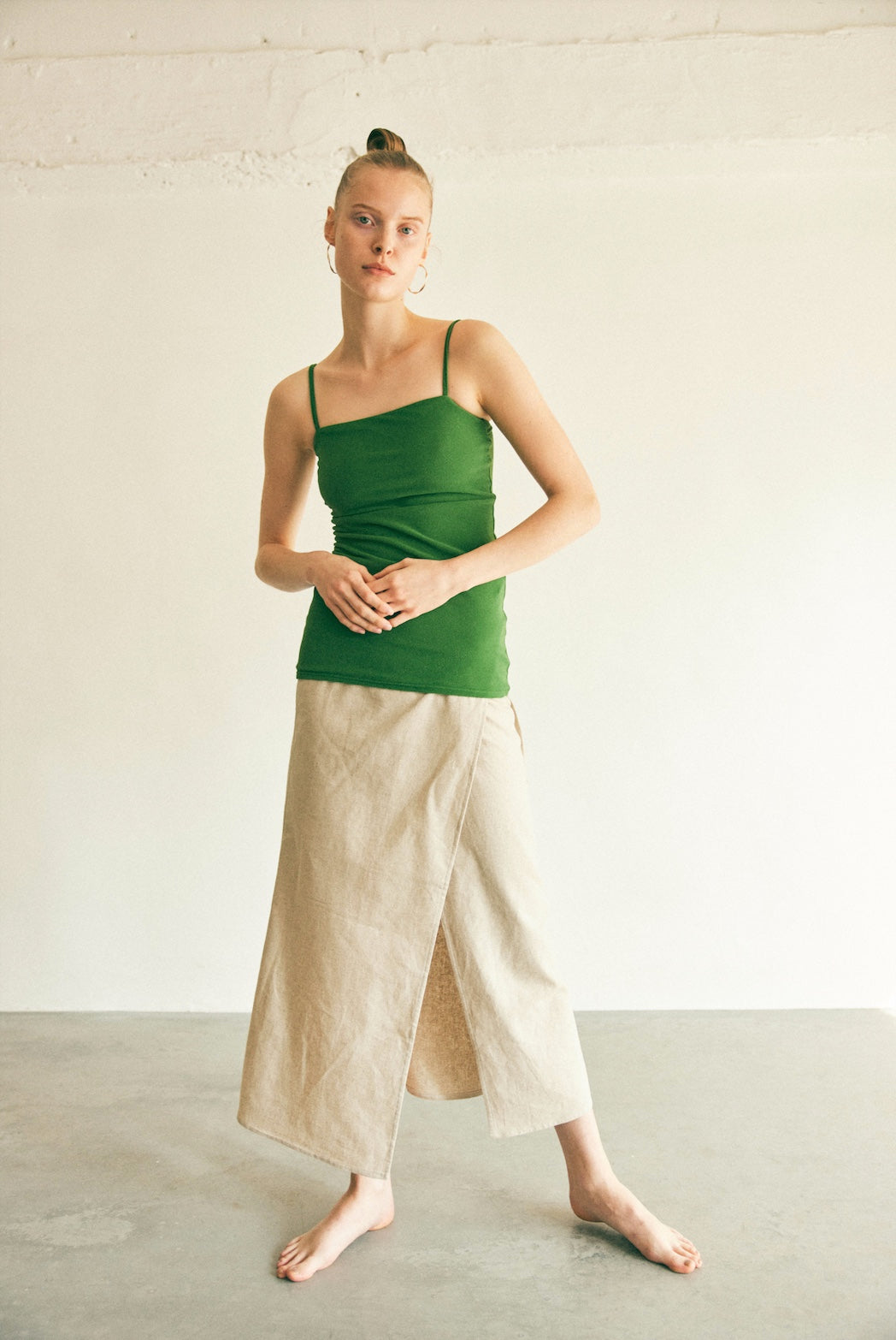 ロング丈のミニマルなスイムキャミソール。レトロなムードでローボトムを覗かせて。もちろん街でも活躍します。